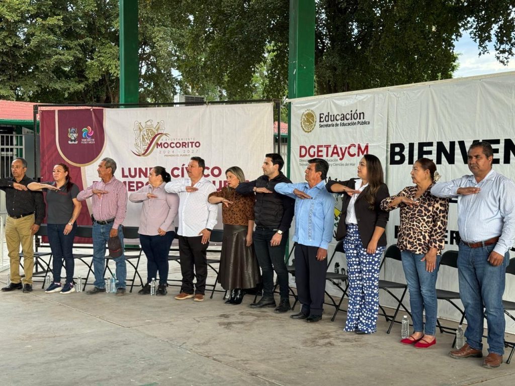 RECOVECO, MOCORITO.- El Ayuntamiento de Mocorito que dirige el Presidente Municipal, Enrique Parra Melecio, a través del área de Vinculación Educativa, llevó a cabo el programa Lunes Cívico en el plantel del CBTA 133, fortaleciendo los valores cívicos y el sentido de identidad entre la comunidad estudiantil.